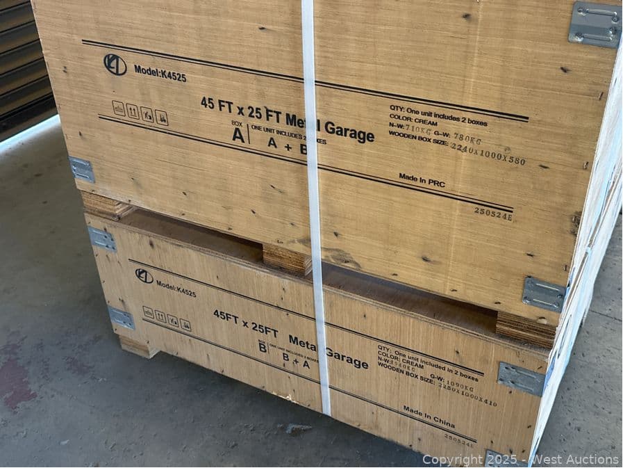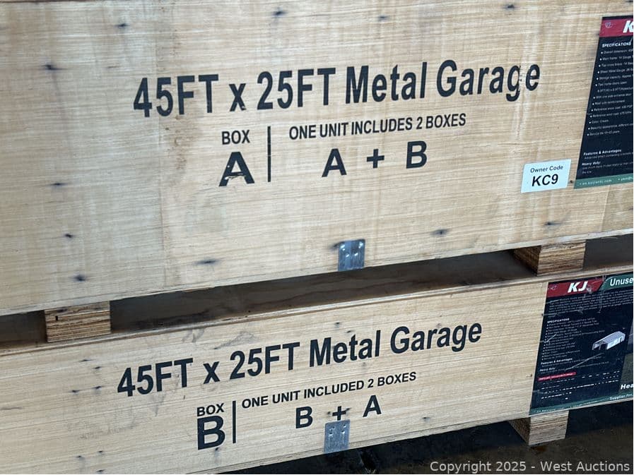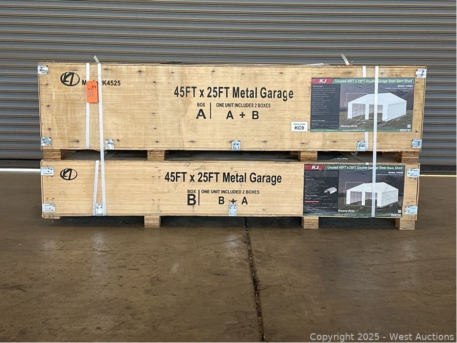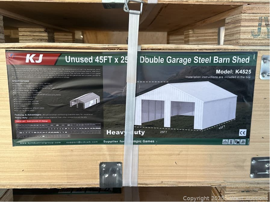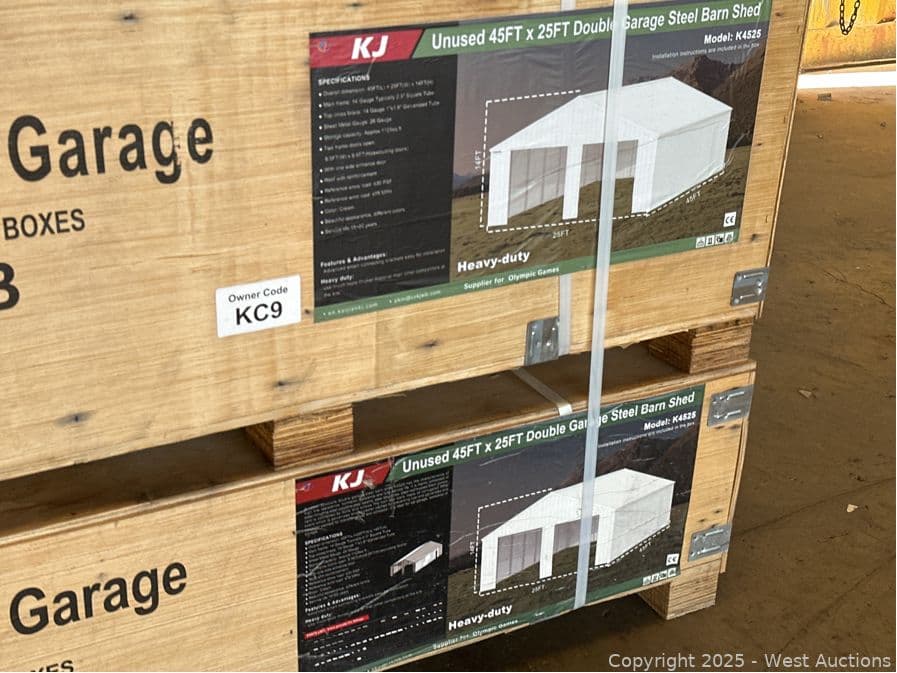 2025 KJ 45'x25' Heavy-Duty Double Garage Steel Barn Shed Model K4525 (Unused) | West Auctions