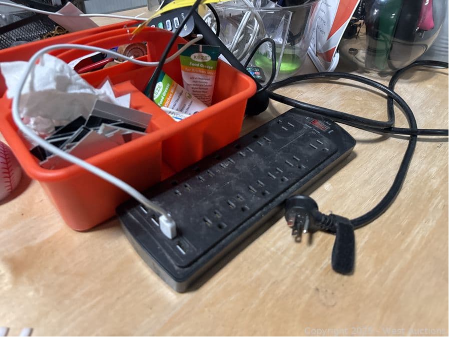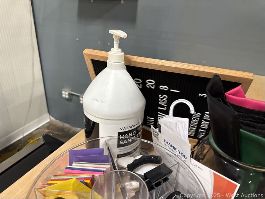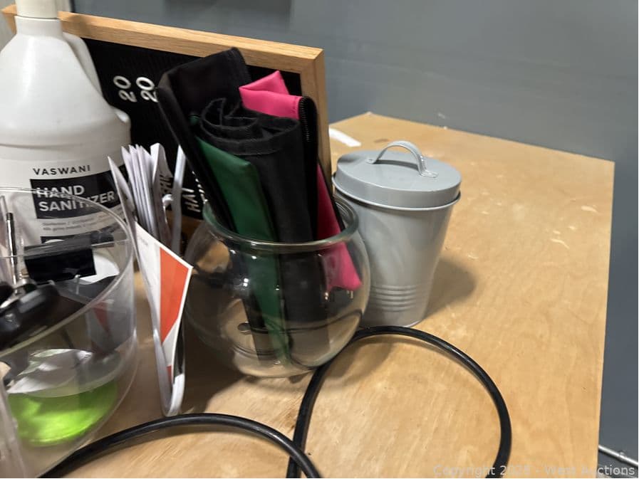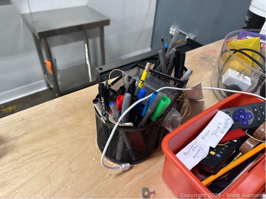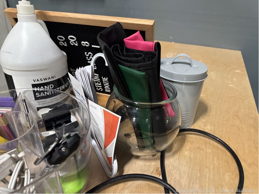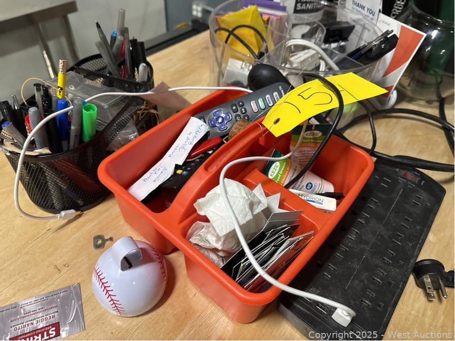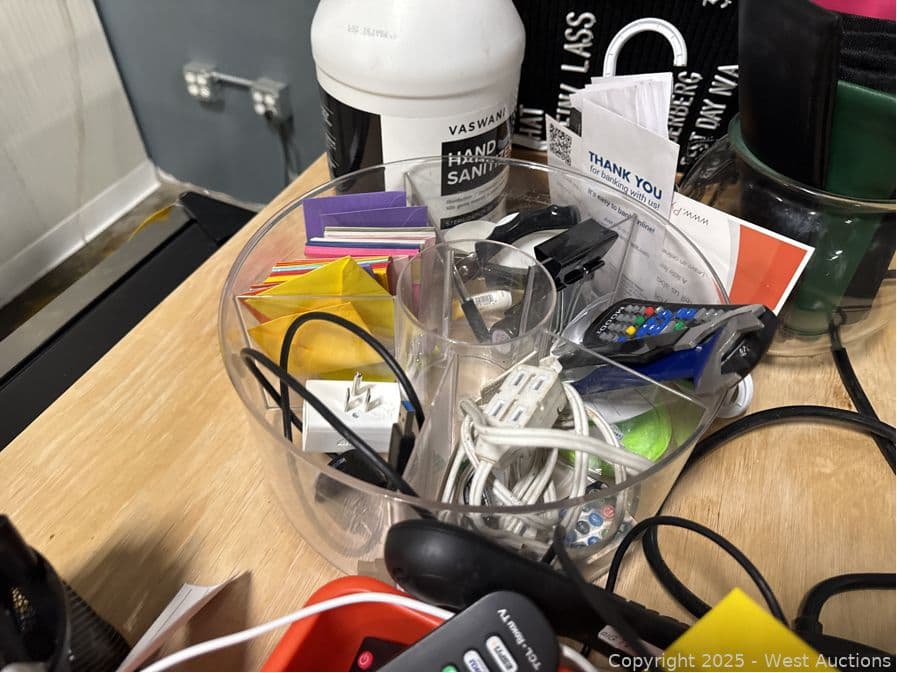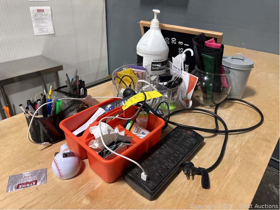 Assorted Stationary, Pens, Power Cables, Hand Sanitizer, Deposit Bags, | West Auctions