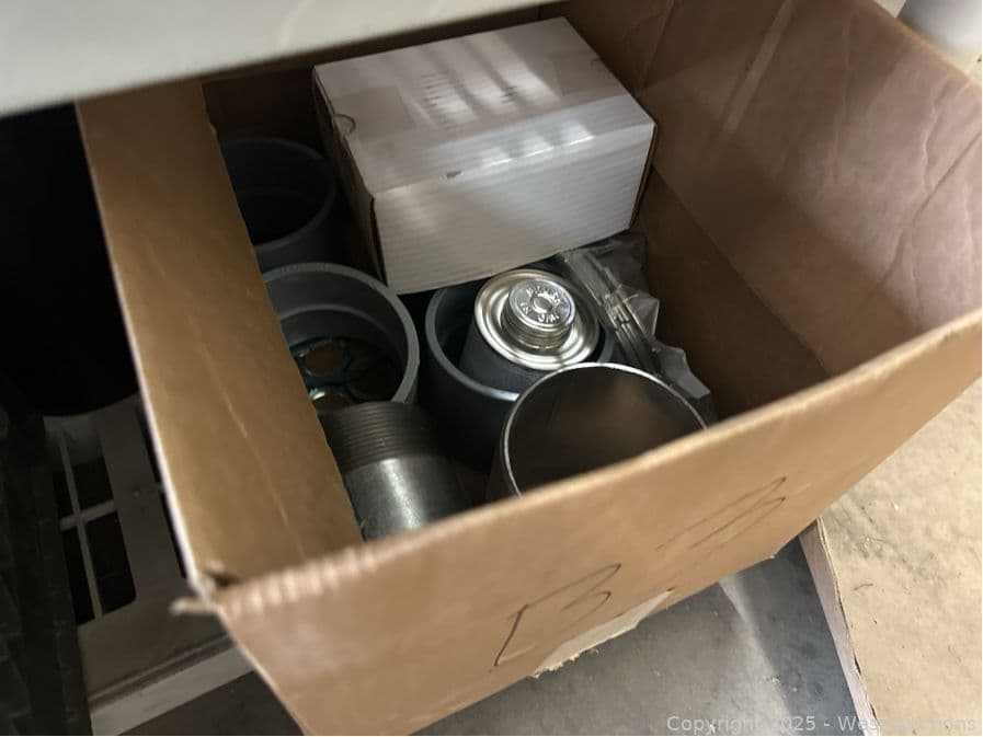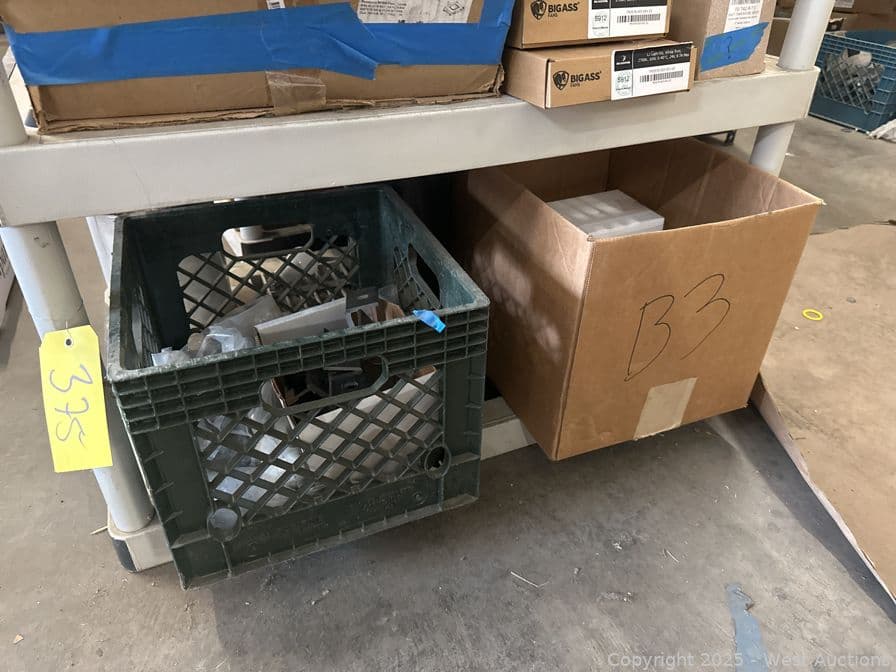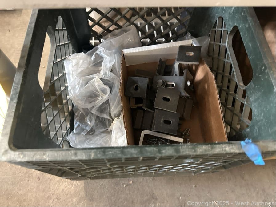 Contents Of Shelf: Bin Of Mounting Brackets And Box Of Scrap Metal | West Auctions