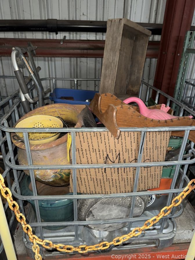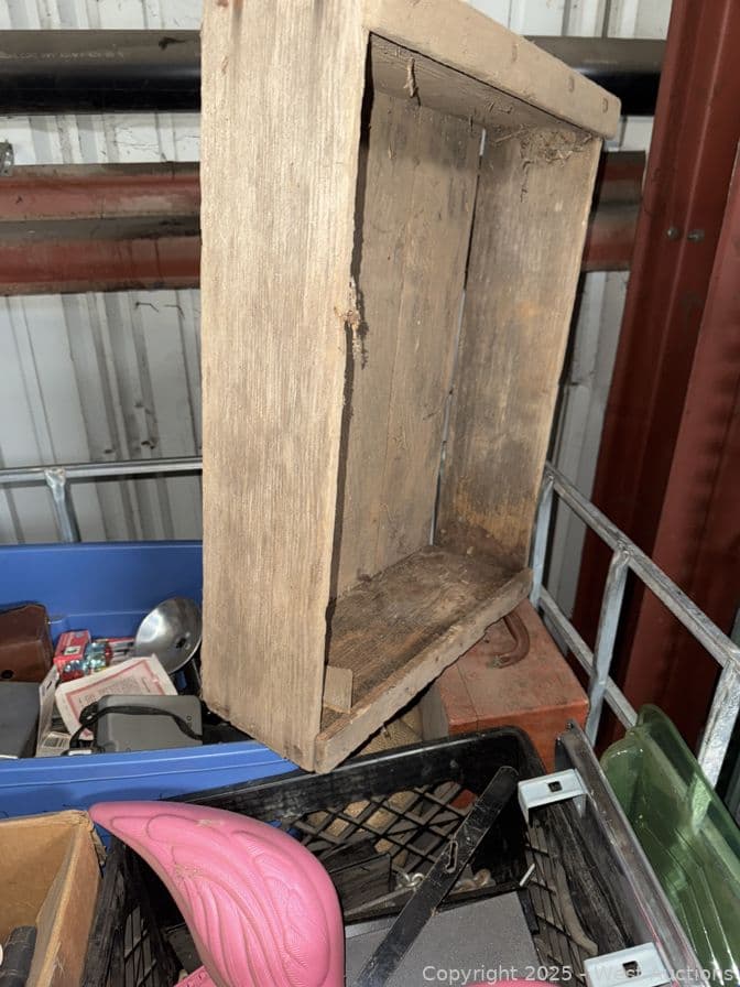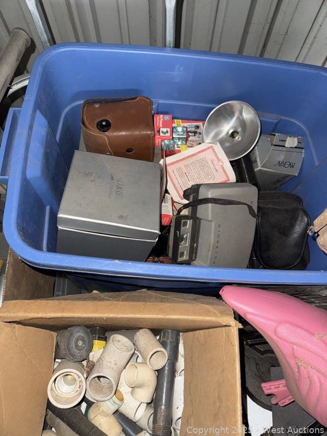 Crate With Contents: Assorted Vintage Items, Pots, Photo Equipment Hardware And More | West Auctions