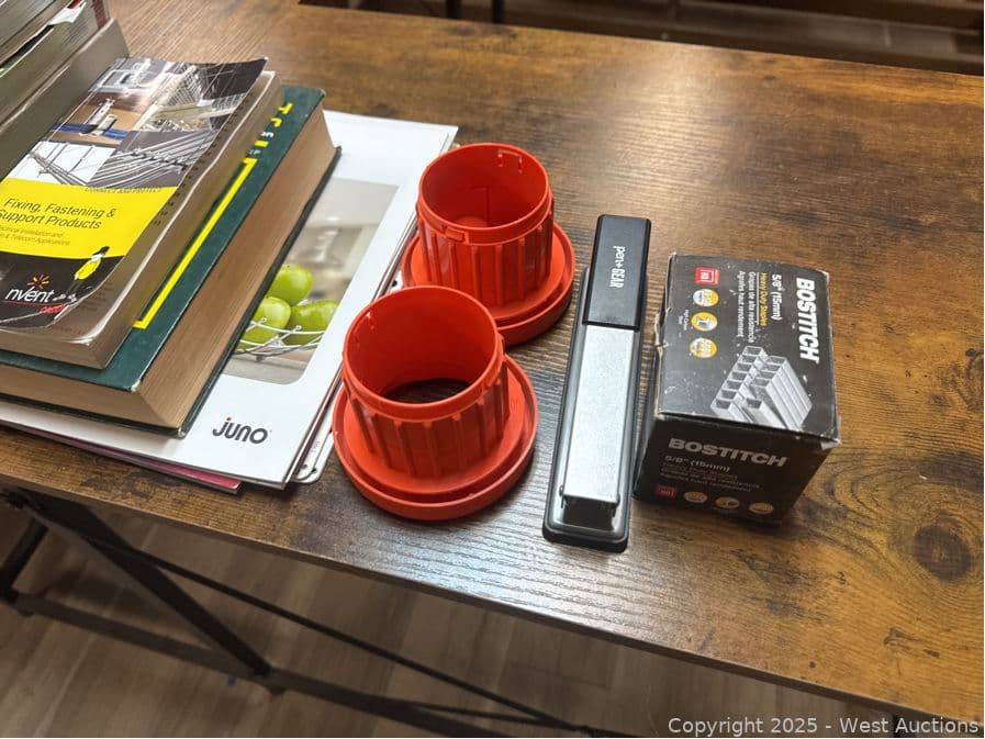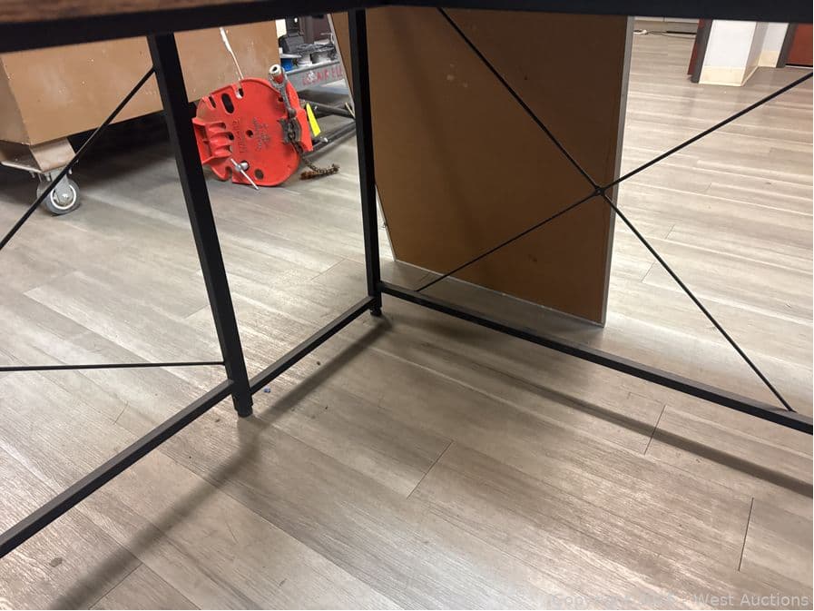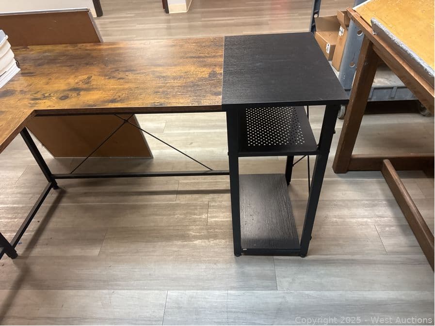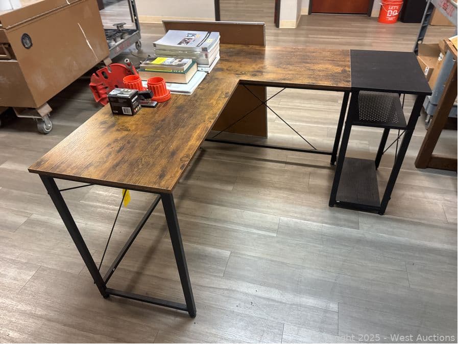 L-Shaped Desk And Contents: Whiteboard, Electricians Textbooks | West Auctions