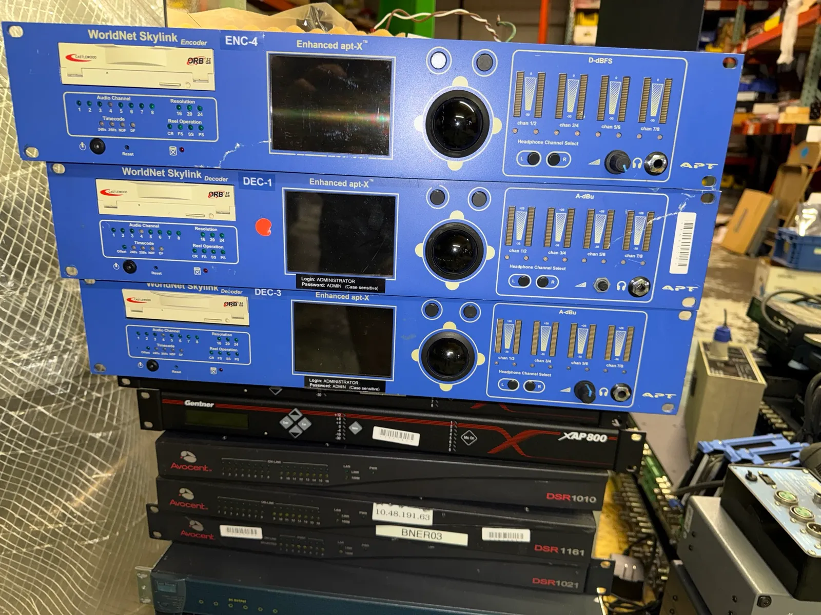 Large Lot Of AV Extron Switches, Crestron Base Stations, Hard Drives, NVision Switches, Worldnet Skylink Gentner, Avocent KVM Switches Honeywell Elmo 8mm Proj | West Auctions