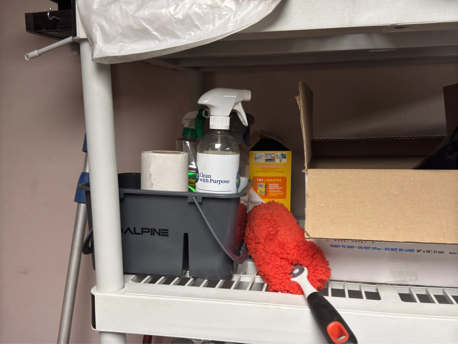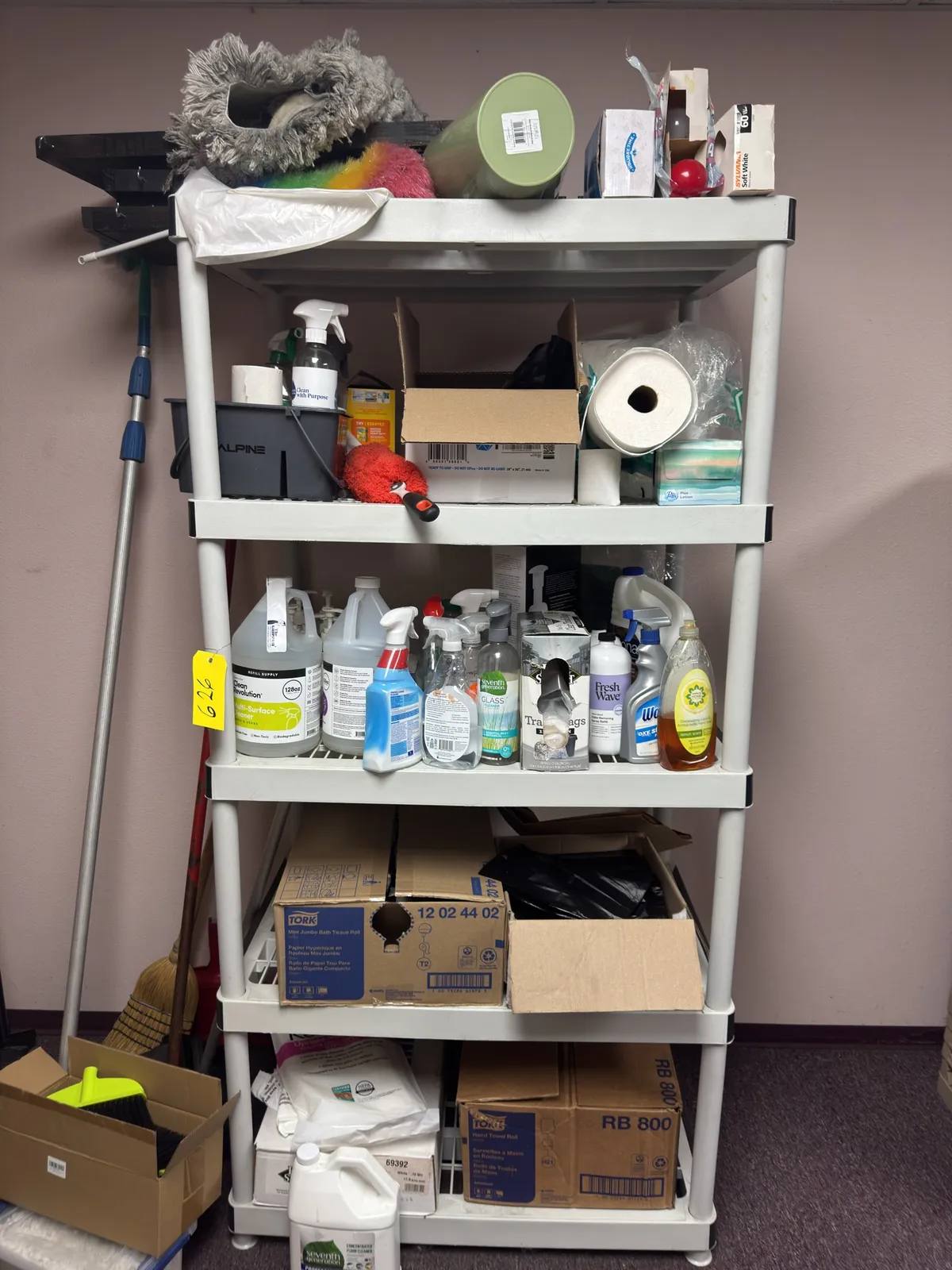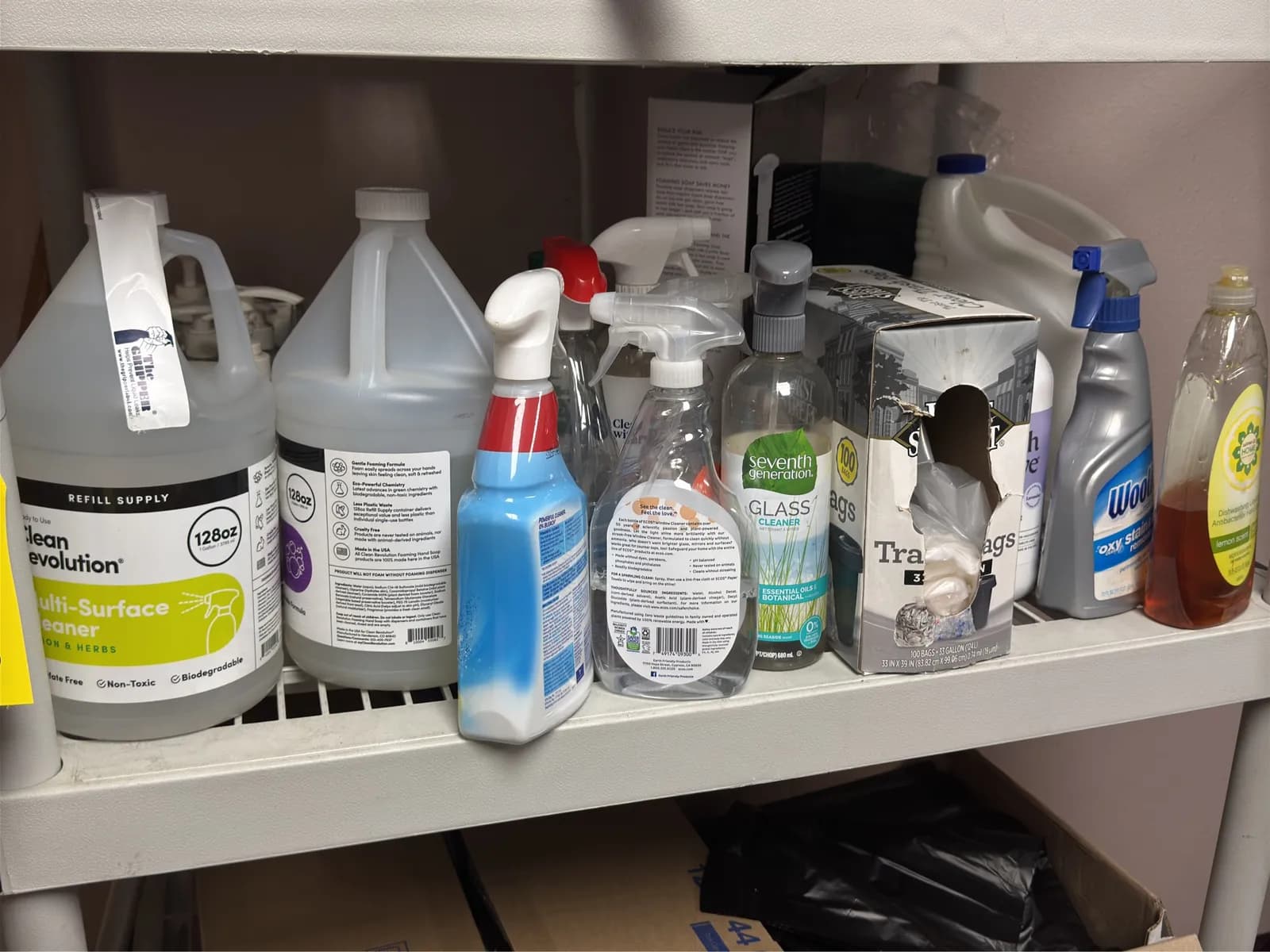 Rack And Contents: Cleaning Supplies, Trash Bags, Bulbs And Wooden Boards. | West Auctions