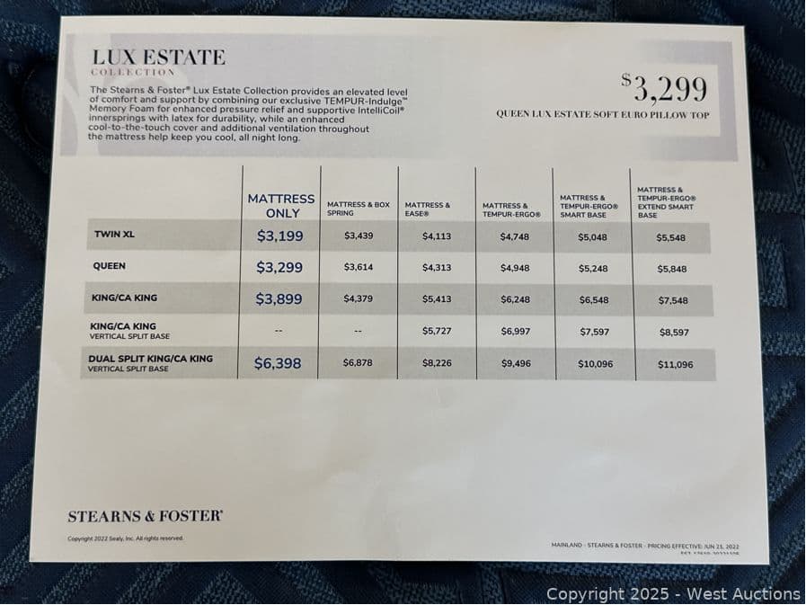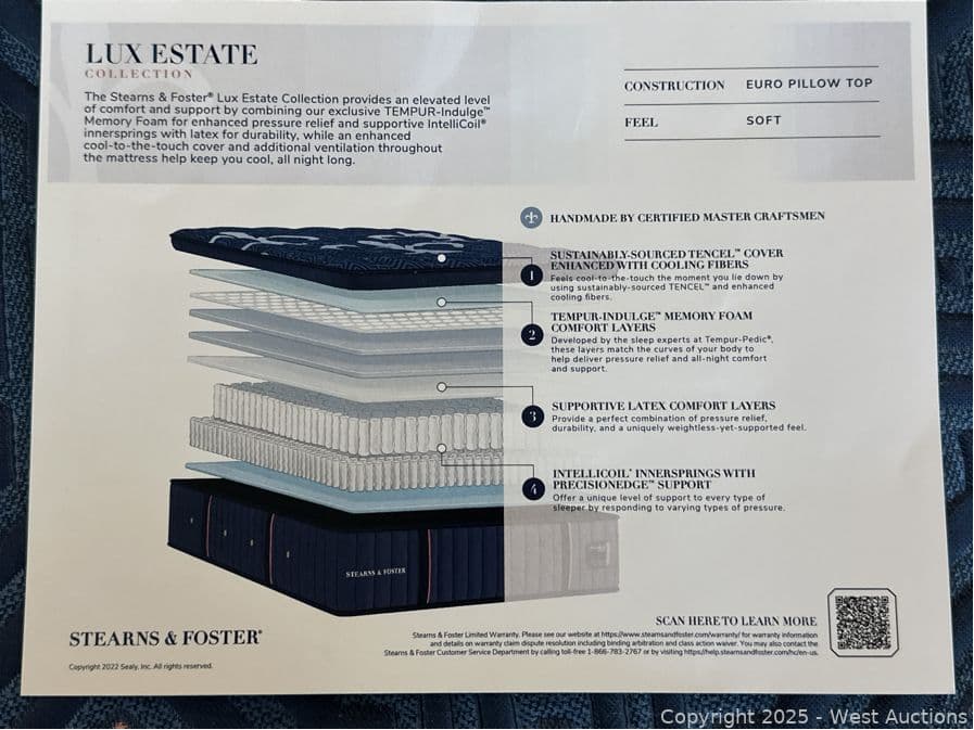 Stearns & Foster Lux Estate Soft Euro Pillow Top - Queen - $3,299 Retail | West Auctions
