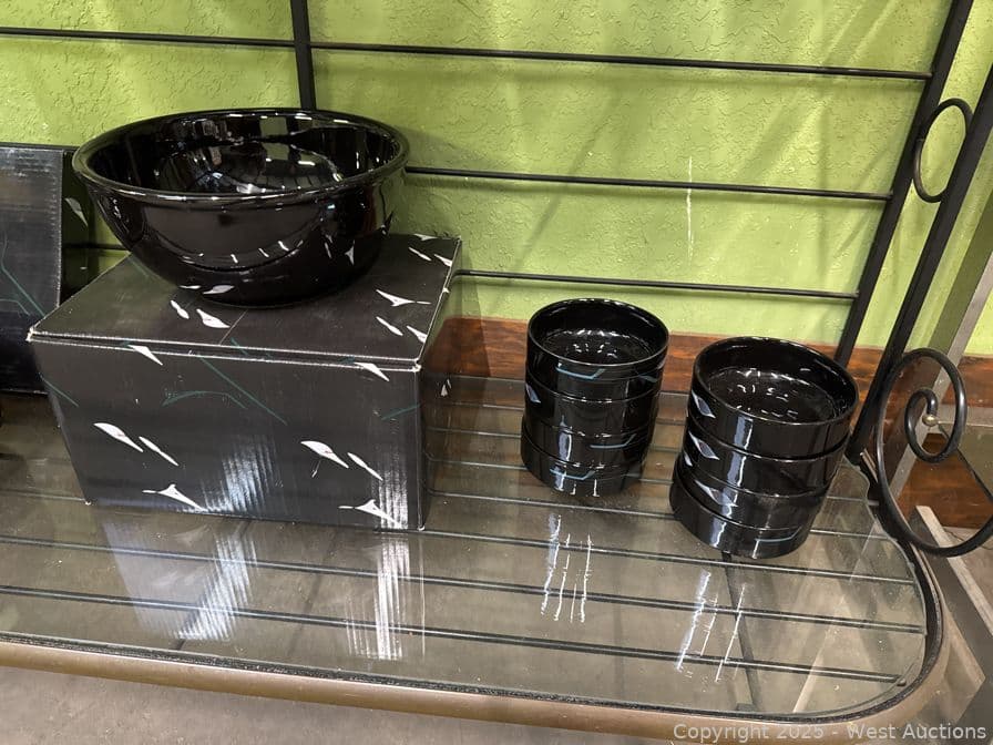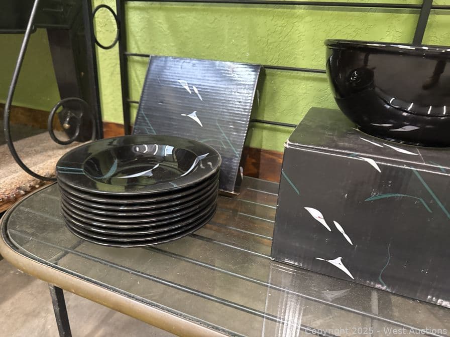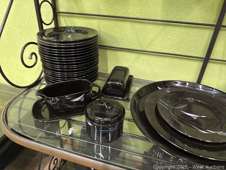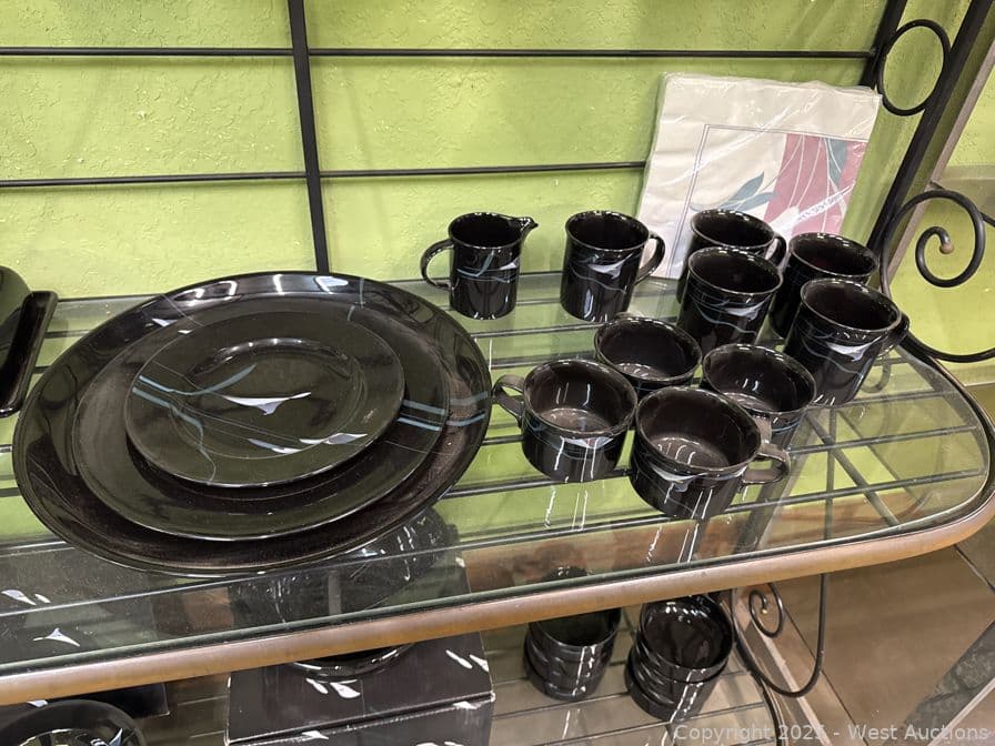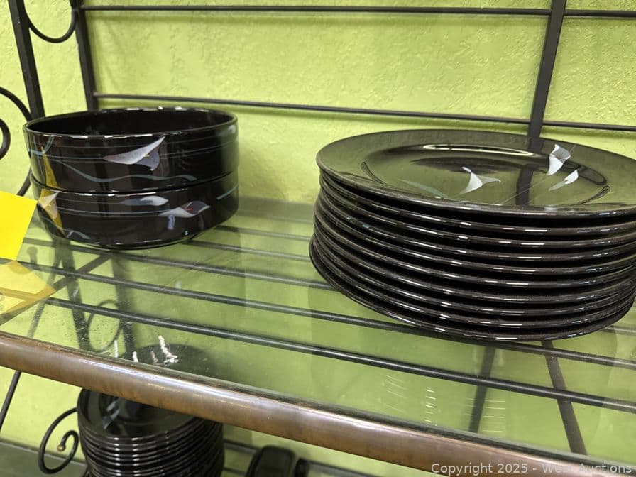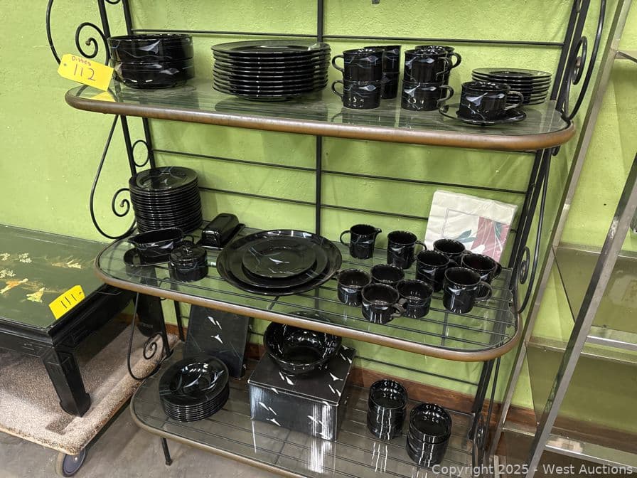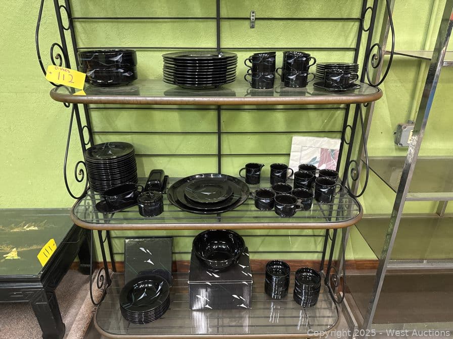 Steel And Glass Display Hutch With Arcoroc And Mikasa Galleria Opus Black Dinner Set | West Auctions